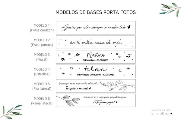 Podrás escoger entre 6 modelos diferentes: frase corazón, frase puntos, floral, estrellas, flor lateral, rama lateral.
