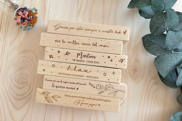La base está hecha de madera 100% natural, por lo que puede cambiar ligeramente el tono y las vetas de cada pieza. Las cortamos y lijamos una a una en nuestro taller, por lo que están libres de barniz y químicos, consiguiendo un acabado suave al tacto.