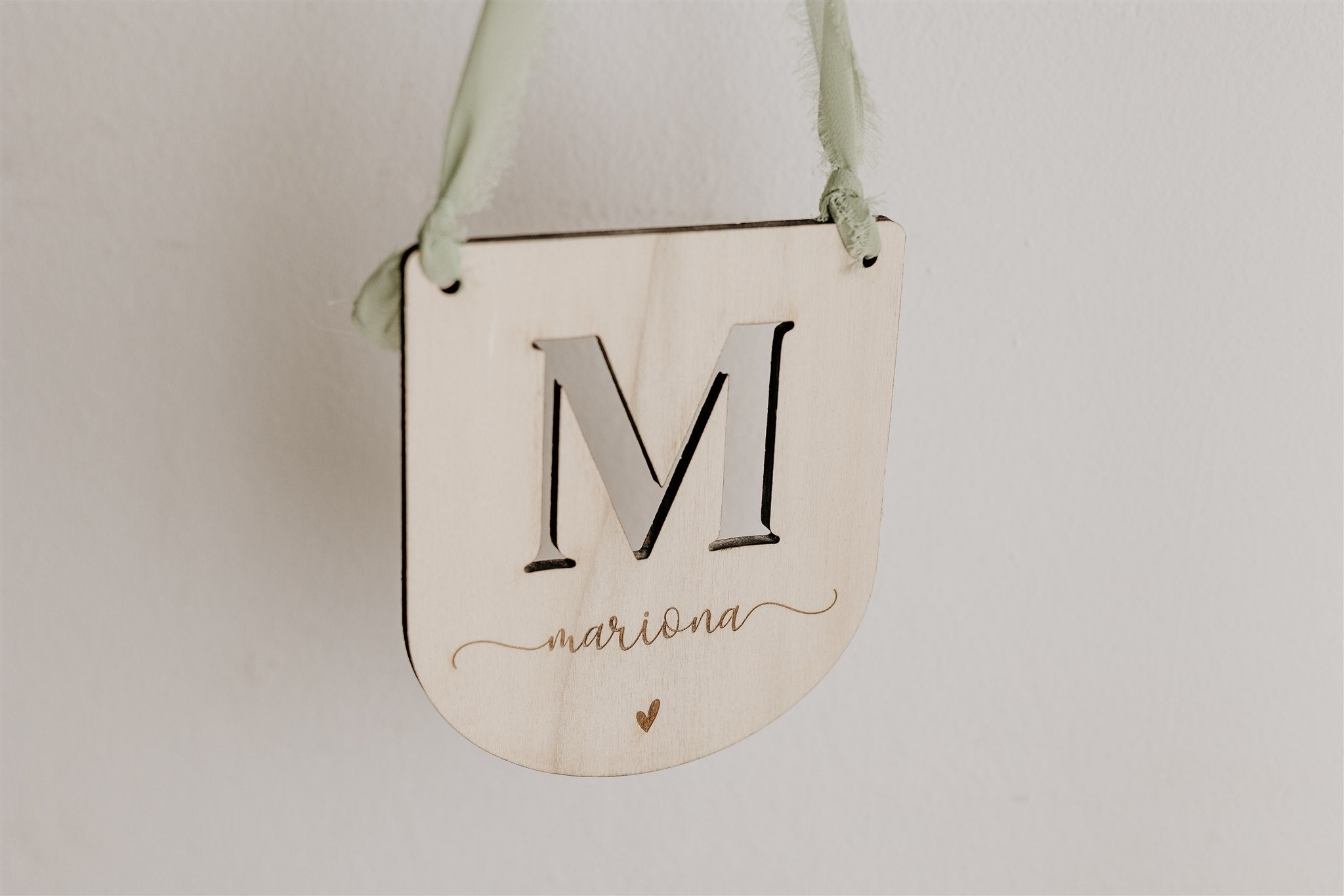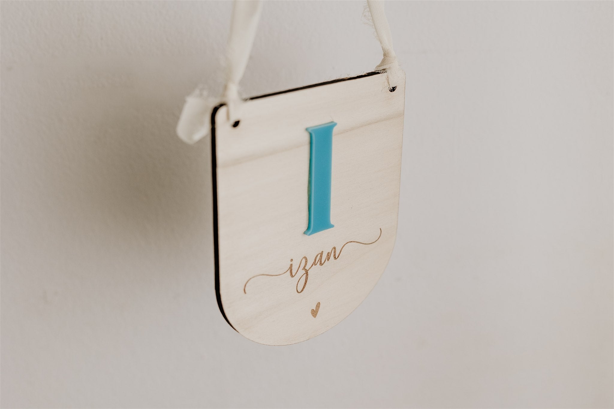 Además el arco con la inical incluye una cinta de gasa para colgarlo y hacerlo así aún más especial.