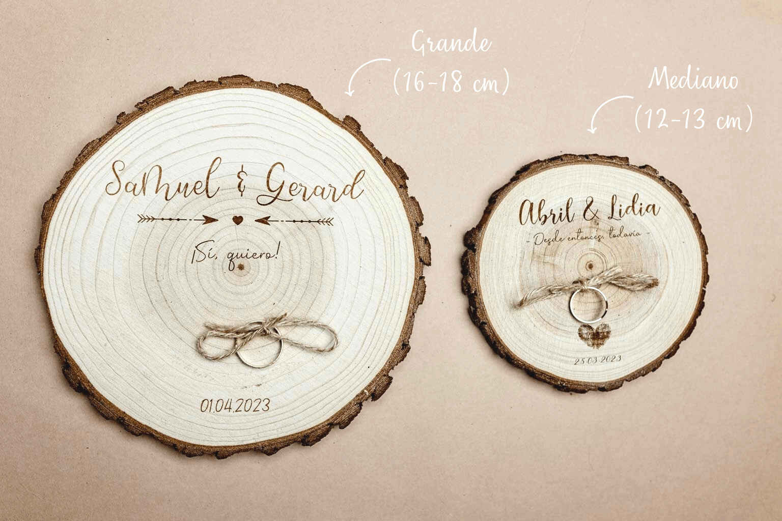 Tenéis dos medidas a escoger: Tamaño mediano (de 12-13 cm de diámetro) o grande (de 15-16 cm de diámetro) y no hay dos iguales, por lo que el tamaño y el fondo puede variar. Se trata de madera natural, así que la tratamos con especial mimo y cariño para que llegue perfecta a vuestras manos.