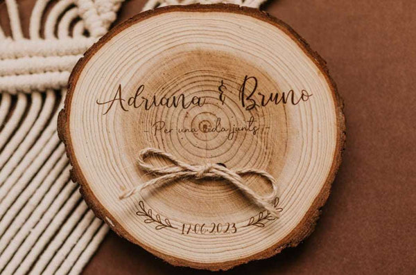 Hay millones de maneras para llevar las alianzas de uno de los días más especiales de tu vida. Pero nosotras apostamos por este porta alianzas natural. Una rodaja de madera natural grabada con láser.