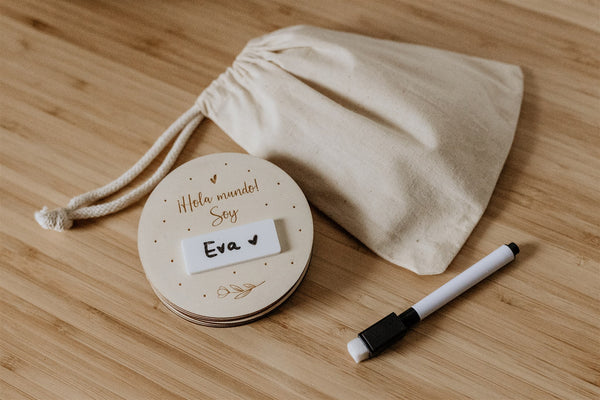 También incluye una bolsita de algodón para guardarlo todo junto y un rotulador para que vayas escribiendo las semanas y los datos necesarios :)