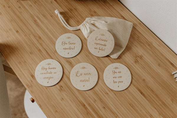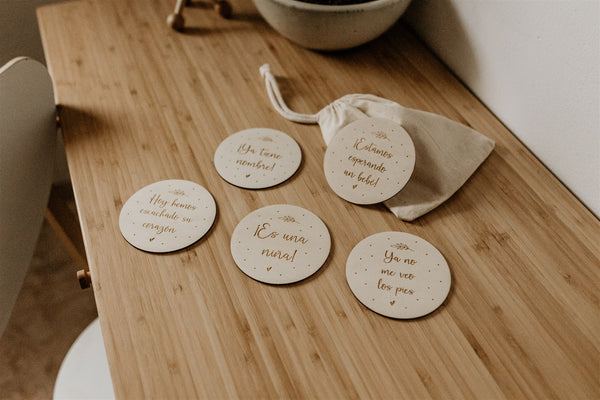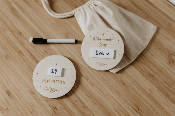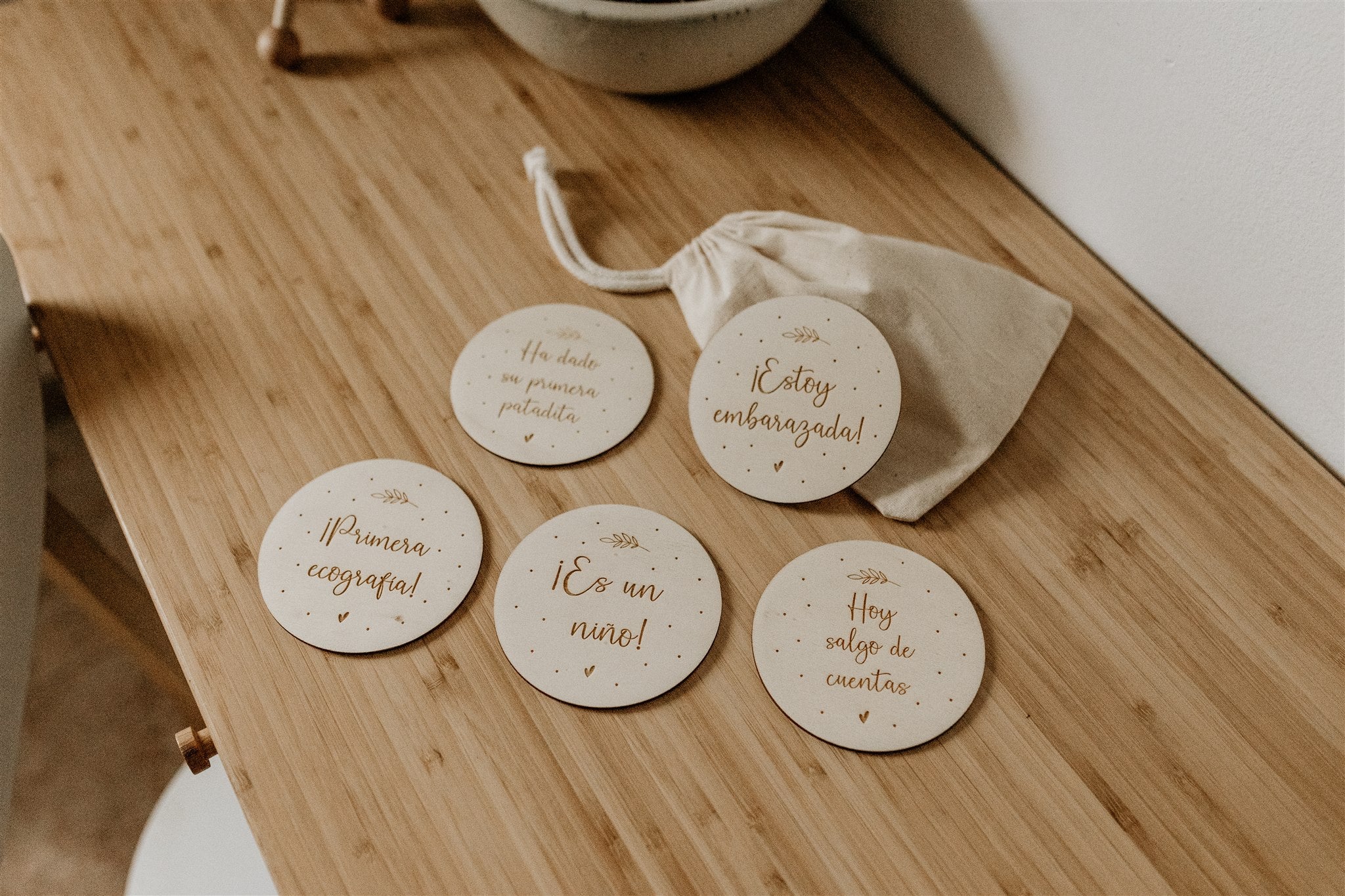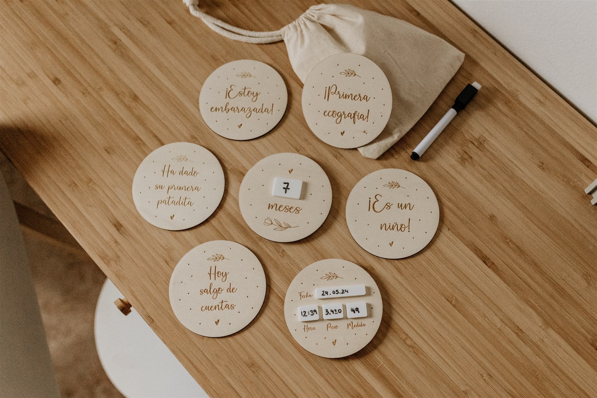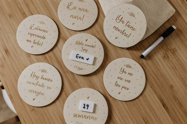 Se trata de 7 placas grabadas por delante y por detrás (así no ocupan tanto espacio) para ir descubriendo poco a poco cada etapa de tu embarazo. Así tendrás el recuerdo de la primera vez que notaste sus patadas, si es un niño o una niña, la primera vez que escuchasteis el corazón... ¡Son momentos mágicos!